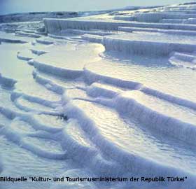 Pamukkale (türkisch: Baumwollschloss) ist eigentlich ein kleiner Ort in der südwestlichen Türkei. Seinen Namen und Bekanntheit erlangte der Ort durch die nahe gelegenen, weißen Kalksteinterrassen. Sie sind aus kalkhaltigem Thermalwasser entstanden und als Weltkulturerbe bei der UNESCO eingetragen. Die Terrassen von